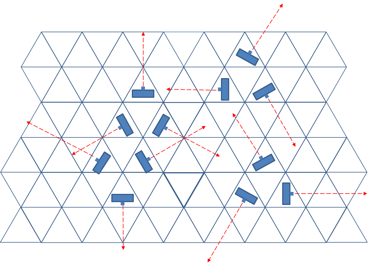 When located in a triangle, a unit can be oriented in 12 different directions: 3 sides, 3 corners, but there also 6 other directions that line up with rows of triangles (see diagram below). This is not unlike a square grid where you have 8 natural facings, or a hexagonal grid that has 12 facings (6 edges + 6 corners).